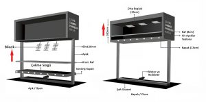 Yukarı Katlanır Asansörlü Vitrin Kasalarımız katlanabilme özelliğine sahip olup darbe ve oluşabilecek yüksek basınçlara dayanıklı olarak imal edilmektedir.