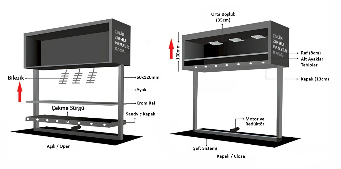 Dış etkenlere karşı ekstra dayanıklılık sağlayan kasalarımız, tüm kilitler ve şifreler açılmadan işlem görmemekle birlikte, sistemimiz dışarıdan görünmeyecek ve müdahale edilmeyecek şekilde özel olarak üretilir.